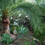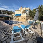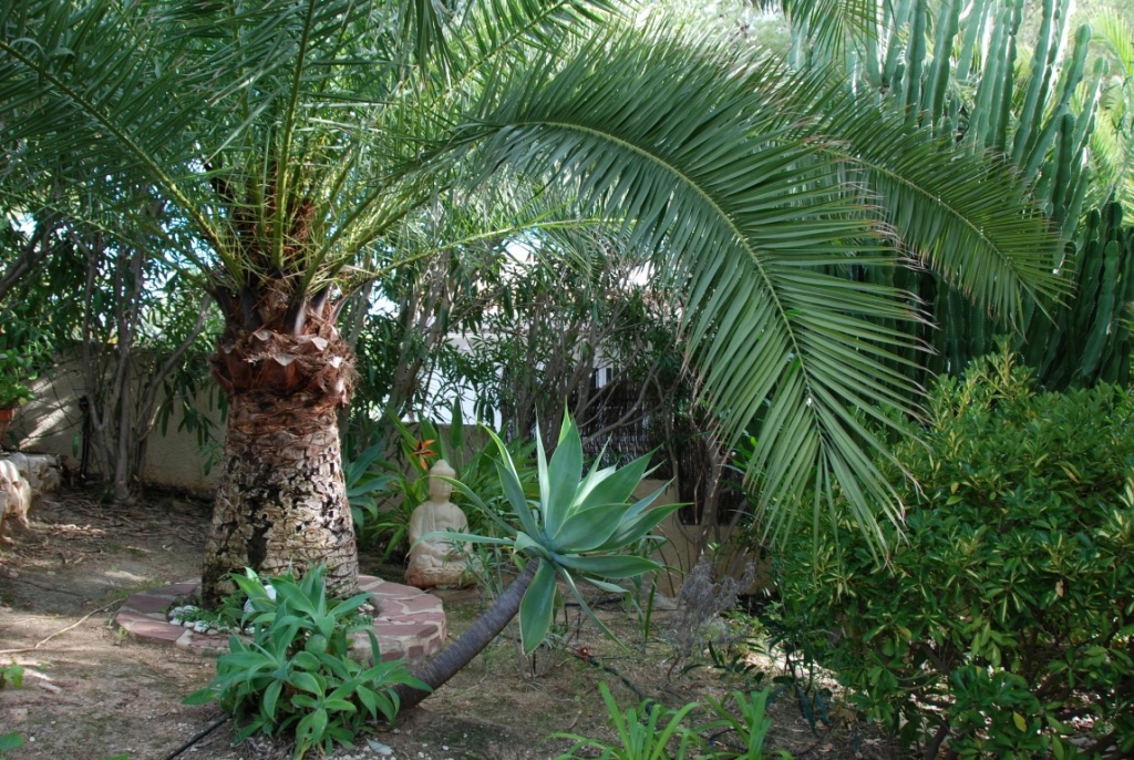 Er zijn 2 manieren om bij het zwembad en het grote zonneterras te komen. Dat is of langs een trap langs de woning of via het appartement. Hier vindt u het grote prive zwembad van bijna 42m2 met een zeer ruim terras, buitendouche en een buitenkeuken. De buitenkeuken is voorzien van een spoelbak, 2 koelkasten en een barbecue. De buitenkeuken is groot genoeg voor een 8 persoons eettafel zodat u hier heerlijk in de schaduw kunt zitten en kunt dineren met uitzicht op het zwembad. Onder de villa bevindt zich nog een separate ruimte waar de wasmachine en wasdroger staan en is er genoeg ruimte om stoelen en kussens op te bergen. De tuin en het zwembad liggen op het zuiden gericht zodat u de gehele dag kunt genieten van de zon. De tuin van de villa grenst aan een baranca waardoor er geen directe buren achter u wonen en u prachtig vrij uitzicht heeft.