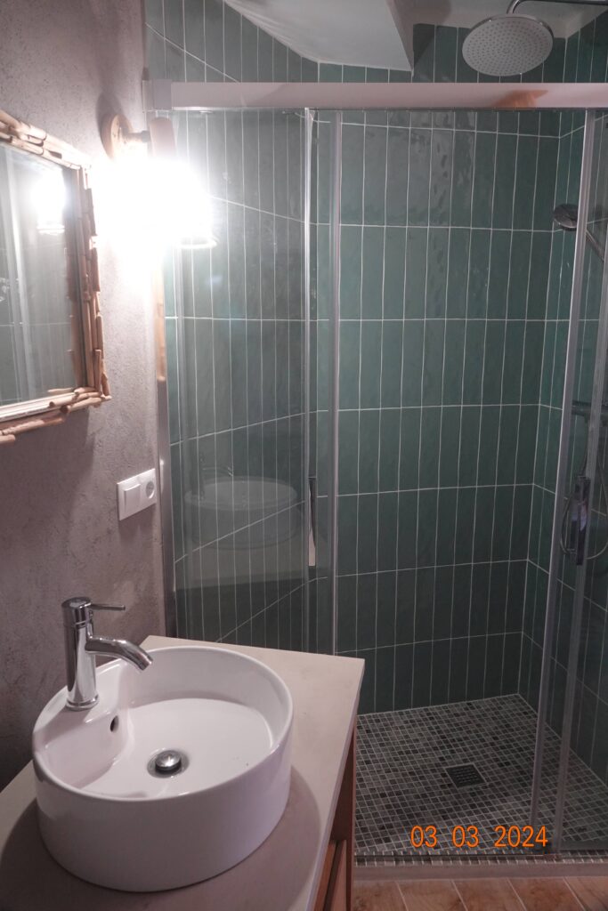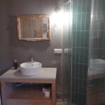 Von dieser Etage aus geht es über eine Treppe nach unten, wo sich eine überdachte Terrasse (auf Spanisch eine Naya) mit Esstisch und Stühlen befindet. Es ist einen schönen Ort zum essen, ein Spiel zu spielen oder etwas zu trinken. Eine weitere Treppe hinunter finden Sie ein Studio mit einem 1-Personen-Bett (wo ein Bett daneben gestellt werden kann), Kühlschrank und einer Dusche mit WC. Dieses schöne Studio eignet sich besonders für ältere Kinder ab 14 Jahren, die sich trauen, alleine oder jemand allein oder ein junges Paar zu schlafen. Aber sie haben einen schönen Platz für sich!