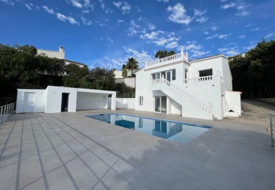 Moderne Ibiza style villa met 4 slaapkamers, 3 badkamers prive zwembad (v.a. 2026 verwarmbaar zwembad) en prachtig zeezicht Benissa randje Moraira