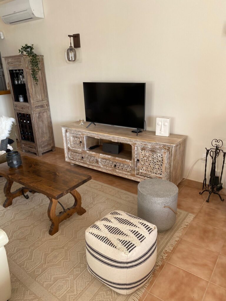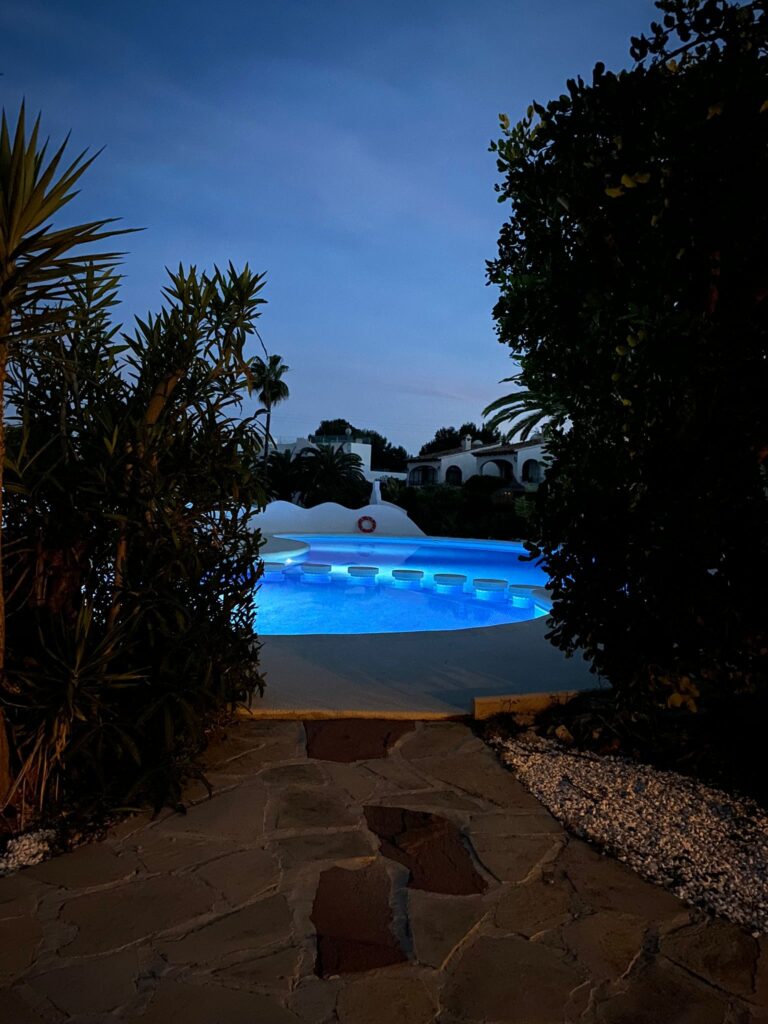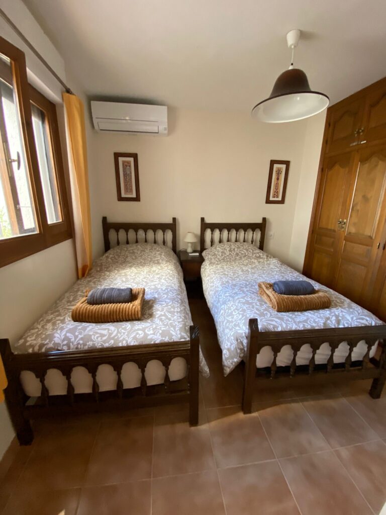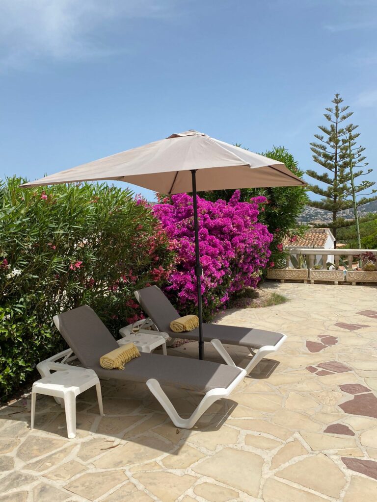 Deze mooie 6 persoons vrijstaande woning in Moraira ligt in een gezellige woonwijk met een groot gemeenschappelijk zwembad aangrenzend aan de tuin en prachtig uitzicht op zee en het zwembad . De woning bestaat uit 2 woonlagen. De bovenverdieping heeft een gezellige ingerichte woonkamer voorzien van airco (warm/koud) en een openhaard, praktisch ingerichte keuken voorzien van o.a. een vaatwasser en een koel-vriescombinatie, 2 slaapkamers voorzien van airco en inbouwkasten, 1 badkamer met bad en toilet en een overdekt terras met zitje vanaf waar u een prachtig uitzicht heeft op zee en het gemeenschappelijke zwembad. Via een trap links buiten het huis komt u in de tuin en daar vindt u de entree van het onderliggende appartement. Het appartement heeft een volledig ingerichte woonkamer, 1 slaapkamer voorzien van airco en 2x 1 persoonsbedden, keuken en een badkamer, waar u ook de wasmachine vindt. Ook voor het appartement is een overdekt terras met een zitje, en dan de tuin met 4 ligbedden, parasols en diverse zitjes en een barbecue. De woning heeft dus diverse plekken waar u in de schaduw kunt genieten van een kopje koffie of een wijntje maar ook een groot zonneterras. Aangrenzend aan de tuin vindt u het prachtige gemeenschappelijke zwembad. Dit zwembad heeft ook een kindvriendelijk deel. Alleen de mensen die in de omliggende huizen wonen mogen gebruik maken van het zwembad zodat het er nooit erg druk is. Moraira centrum en het Ampolla strand ligt op een kleine 5 minuten rijden van de woning. De golfbaan van Club de Ifach in Benissa is te bereiken binnen een paar minuutjes rijden evenals de grote supermarkt Pepe la Sal. Uw auto kunt u voor de woning parkeren voor de entree van de woning.