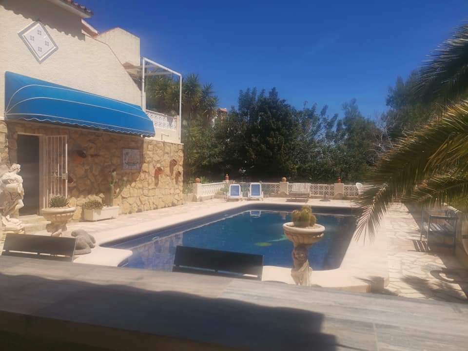 Dit is een sfeervolle Spaanse villa met groot prive zwembad (41,64m2) in Moraira op slechts 2,5 kilometer van Moraira centrum en de zandstranden! De villa heeft een bebouwde oppervlakte van 220 m2 en een grondstuk van 1000 m2. Zodra u het afgesloten terrein betreedt wordt u verrast door de prachtige tropische tuin! Het overdekte terrasje voor het huis heeft een gezellig zitje! Via de voordeur komt u in de woon- en eetkamer met aangrenzend de open keuken. De open keuken is voorzien van o.a. een vaatwasser, magnetron, oven en koelkast met vriesvakken. Op deze etage vindt u ook de hoofdslaapkamer. Voor de woonkamer is er een terrasje met prachtig uitzicht op het zwembad en de baranca en heeft u toegang tot het dakterras met ook weer dat prachtige uitzicht.